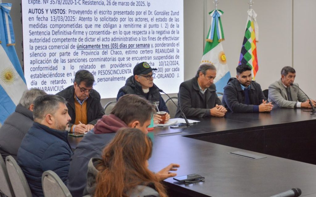El Ministerio de la Producción y el Desarrollo Económico Sostenible, presidió una reunión en el Salón Obligado de Casa de Gobierno, destinada a pescadores comerciales matriculados y a las asociaciones que los representan. El encuentro tuvo como objetivo informar sobre la normativa vigente que regula la pesca comercial en el territorio provincial, en cumplimiento de lo dispuesto por el Juzgado Civil y Comercial N.º 21 de Resistencia, en el marco de la causa “Ranza Adolfo y otros”.