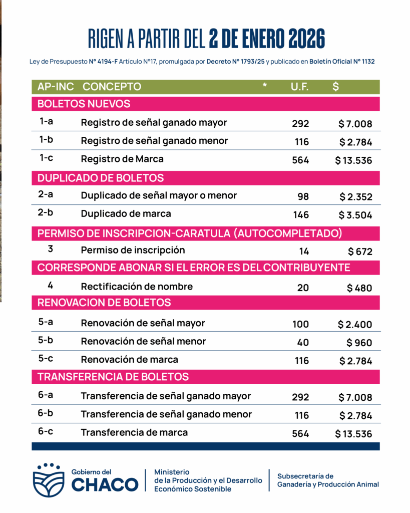 La Dirección de Ganadería, del Ministerio de la Producción y el Desarrollo Económico Sostenible, como organismo de aplicación de la Ley de Marcas y Señales, informa a productores, consignatarios y público en general que, en el marco de lo dispuesto por la Ley de Presupuesto N° 4194-F, se estableció el nuevo valor de la Unidad Fiscal correspondiente al ejercicio 2026.